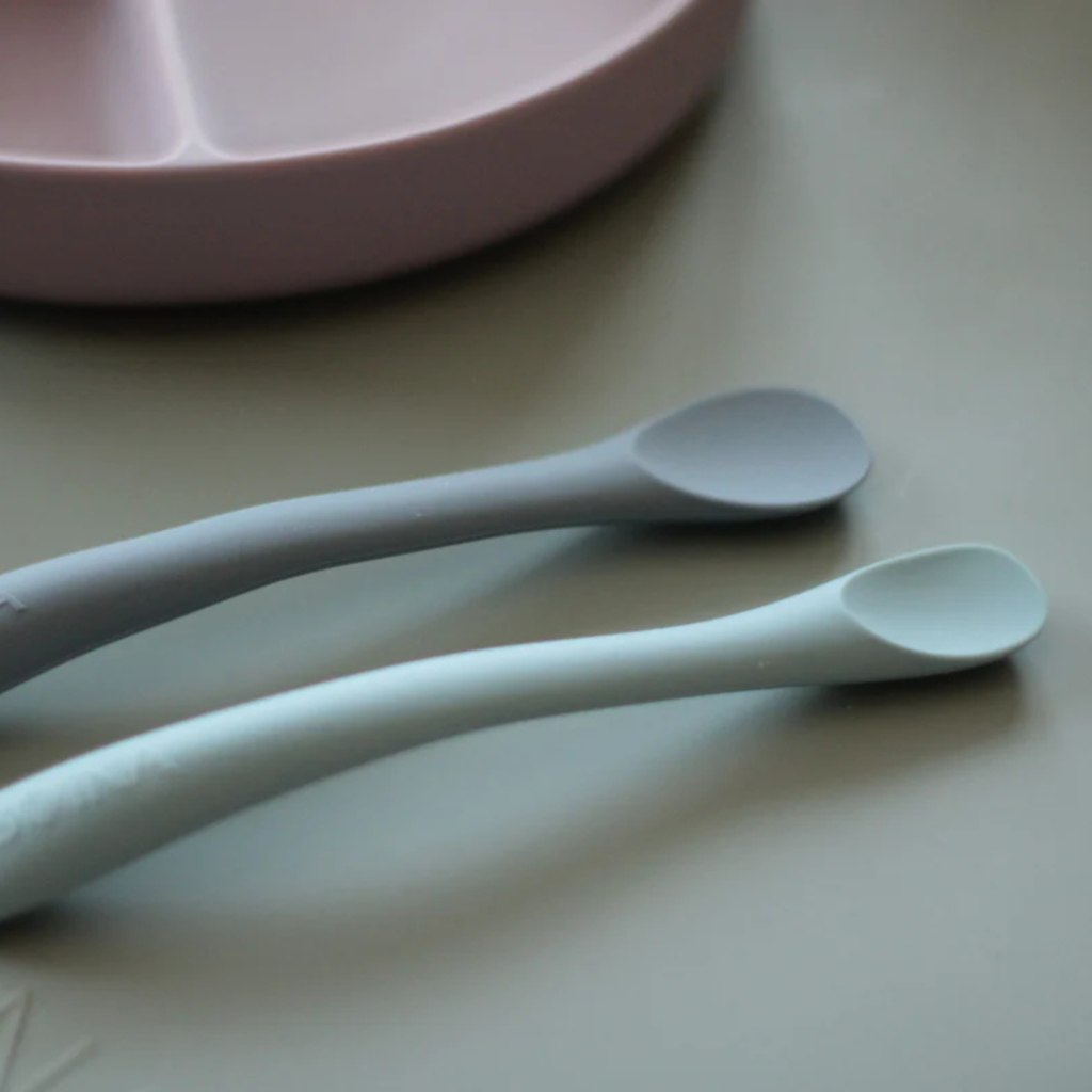 Le set comprend deux tailles complémentaires : une cuillère fine idéale dès 4/5 mois, et une cuillère plus large adaptée dès 8/9 mois, pour accompagner l’évolution des textures au fil de la diversification.