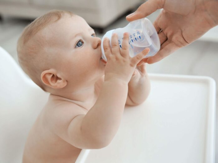 De sa naissance jusqu’à la diversification alimentaire, le lait sera son pourvoyeur essentiel de liquide ; en moyenne, un enfant allaité ou au biberon atteint rapidement le rythme de croisière de 800 ml de lait par jour, voire un peu plus. Ensuite, au moment de la diversification alimentaire, la quantité de lait consommée baisse à une moyenne de 500 ml de lait par jour (en 2 ou 3 biberons) ; il faudra donc compléter par 400 à 500 ml d’eau, soit minérale faiblement minéralisée de type Evian ou Volvic – ou en eau de source de type Cristaline, soit de l’eau de robinet après avoir vérifié qu’elle soit bien pauvre en nitrates (informations détenues par la Mairie) comme c’est le cas dans la majorité des régions de France ; elle est bien évidemment potable.