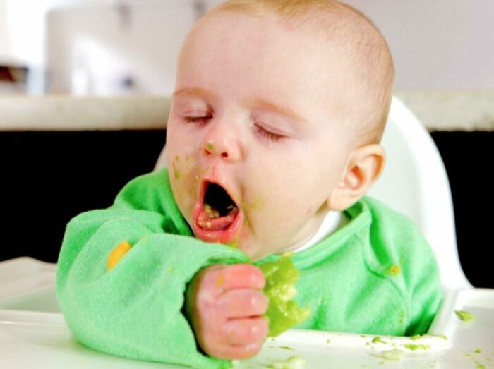 Celui-ci peut reculer également avec l’alimentation solide. Bébé va aussi se créer des sensations avec les morceaux, en les mettant plus ou moins loin dans la bouche.